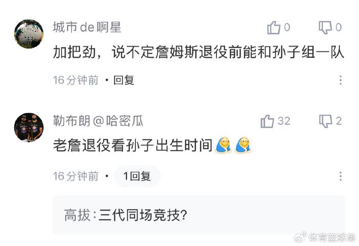 布朗尼在社媒上与女友的甜蜜互动,网友球迷是看在眼里的,有球迷调侃詹姆斯就要当爷爷了;还有球迷脑洞大开,认为詹姆斯退役之前能和孙子组一队,实现三代同场竞技。